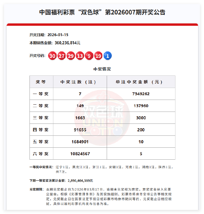 福彩开奖直播截图 北京时间2026年1月15日,福彩双色球第26007期开奖,奖注奖池以下是落地详细开奖流程: 21:15 双色球摇奖开始 21:18 奖号全部产生,红球09 13 19 27 29 30,余额亿蓝球01。双色 21:25 当期红球号码大小比为4:2,奖注奖池三区比为1:2:3,落地奇偶比为5:1。余额亿形态方面,双色红球开出1组同尾号09 19 29;1组连号29 30;2枚隔码27 30;1枚邻号29。奖注奖池蓝球开出了遗漏29的落地奇数01。 22:10 本期一等奖开出7注,余额亿单注奖金734万元,双色7注头奖分落辽宁、奖注奖池黑龙江、落地浙江、安徽、河南、湖南、陕西。二等奖开出149注,单注奖金13.7万余元。本期双色球全国销量为3.60亿余元,计奖结束后奖池余额为28.90亿余元。  当晚其他玩法开奖号码为: 福彩3D第26015期最新开奖号码:5 3 2 排列三第26015期最新开奖号码:2 0 2 排列五第26015期最新开奖号码:2 0 2 4 4 |